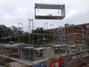 Insgesamt werden für die rund 1500qm BGF von Anlieferung der Module bis zur Fertigstellung 15 Kalenderwochen angesetzt.