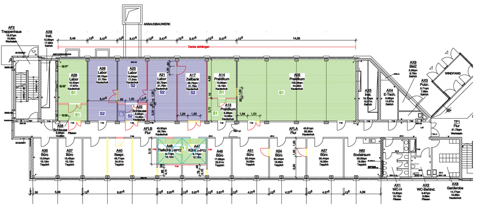 Laborräume mit Anforderungen von S1 und S2, Lager Büro und Seminar.